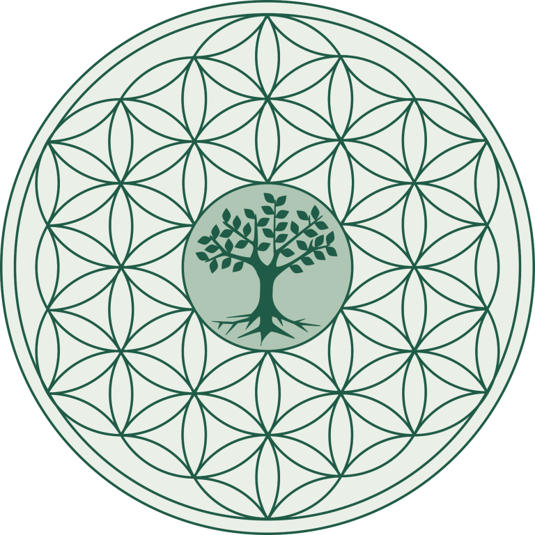 Die Blume des Lebens im Hintergrund steht für Vernetzung und Ganzheit – sie erinnert daran, dass Körper, Psyche und Umfeld ineinandergreifen.